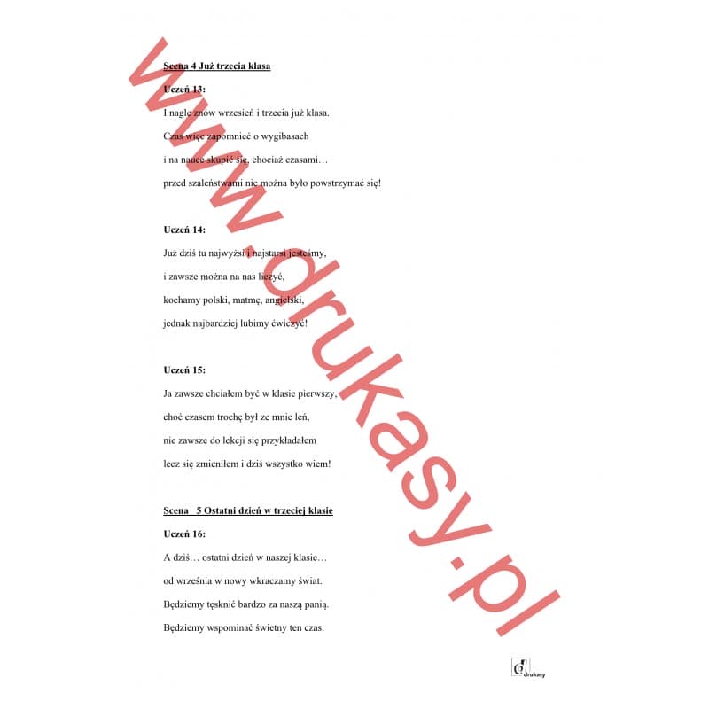 Scenariusz przedstawienia na zakończenie roku dla uczniów klas trzecich „Podróż przez lata” opowiada o ich przemyśleniach podczas nauki w szkole podstawowej. Każda scena to wspomnienie innej sytuacji - od pierwszego dnia w szkole, przez przerwy, wydarzenia klasowe, aż po pożegnanie i podziękowania dla dyrektora, wychowawczyni, nauczycieli, pracowników szkoły i rodziców. Uczniowie wspominają lata edukacji wczesnoszkolnej deklamując krótkie czterowersowe, rymowane wierszyki. Jest i humor, i powaga. I propozycje fragmentów muzycznych. Scenariusz został przygotowany w taki sposób, aby można go było dostosować do ilości uczniów w klasie (skrócić lub podzielić role).